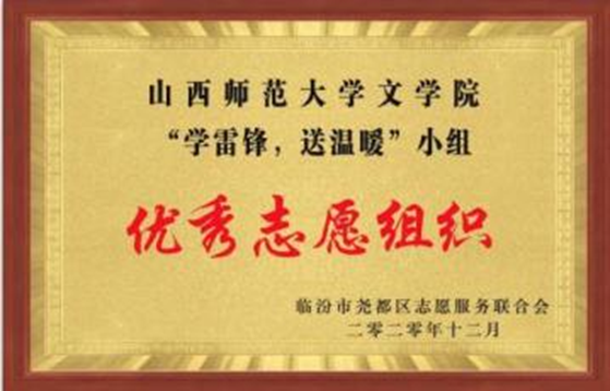 2020年12月,“学雷锋,送温暖”小组被临汾市尧都区志愿服务联合会授予“优秀志愿组织”。