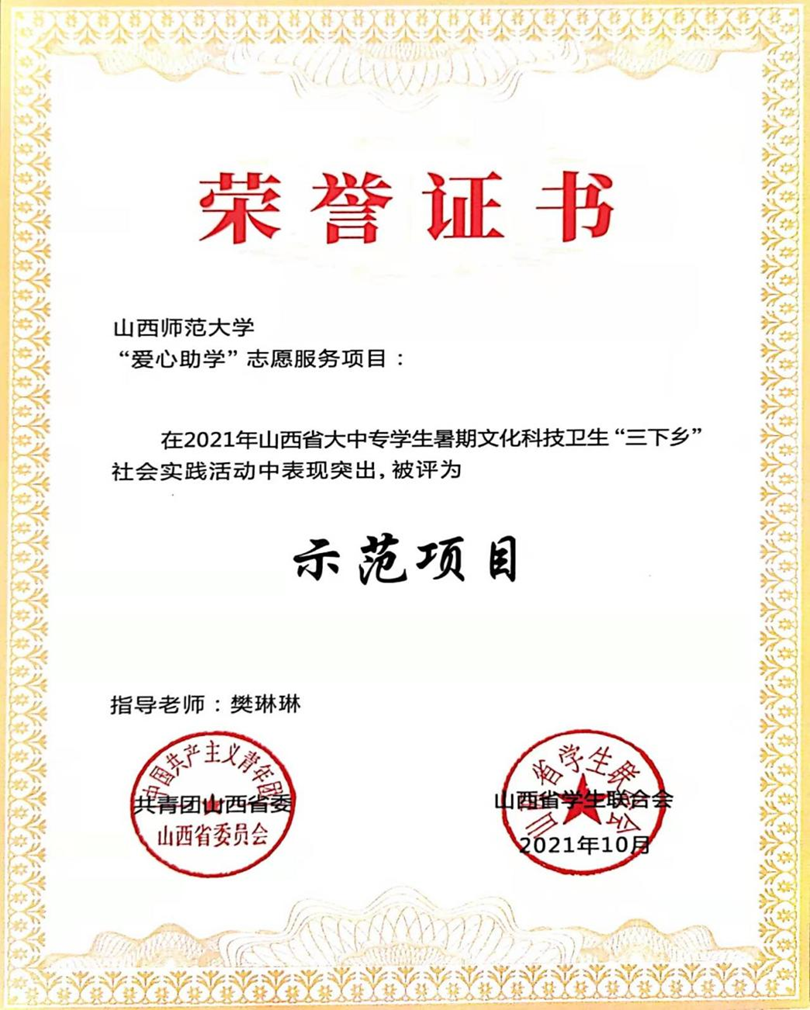 2021年10月,“学雷锋,送温暖”小组线上“爱心助学”志愿服务项目被评为2021年山西省中大专员工暑假文化科技卫生“三下乡”社会实践活动“示范项目”。